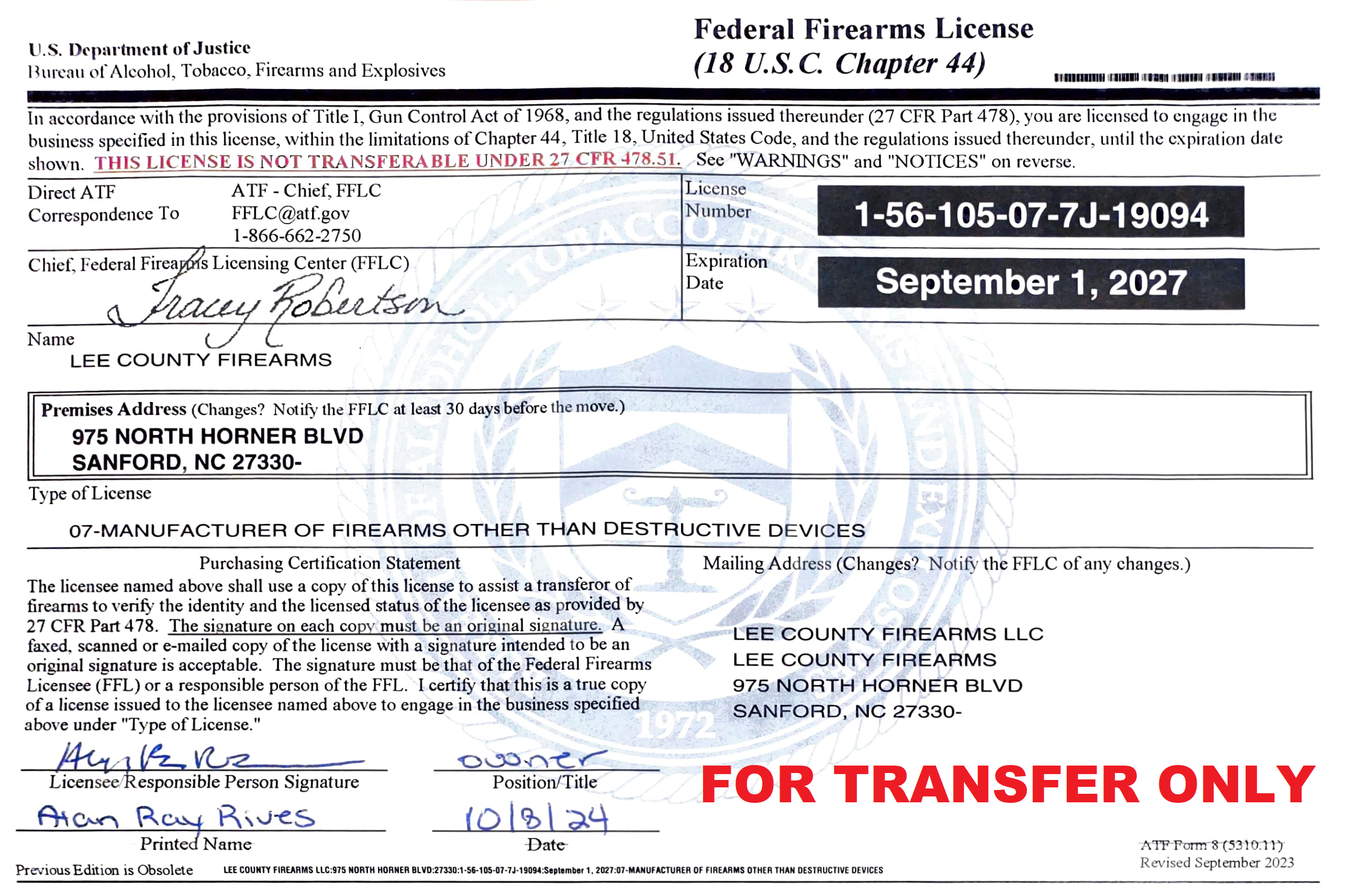 Typically, your dealer or store will request a copy of our FFL for transfers as a final step. Below are links to the critical portion